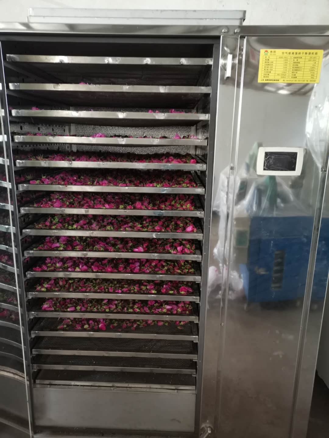 玫瑰花的干燥方法很多,常見的有自然干燥、自然陰干、速凍干燥和烘干等。其中自然干燥和自然陰干兩種方法雖然可以獲得很好的效果,既省力又方便。但是,采用上述2種方法都不能有效地殺死附著在玫瑰花朵上的蟲卵,玫瑰干花在存放2—3個月以后會有蟲子從中生出。因此,自然干燥法不宜用作玫瑰干花的商品生產。泰保玫瑰花烘干機干燥可以很好的保護玫瑰花中的有效成分,是生產玫瑰干花的方法。